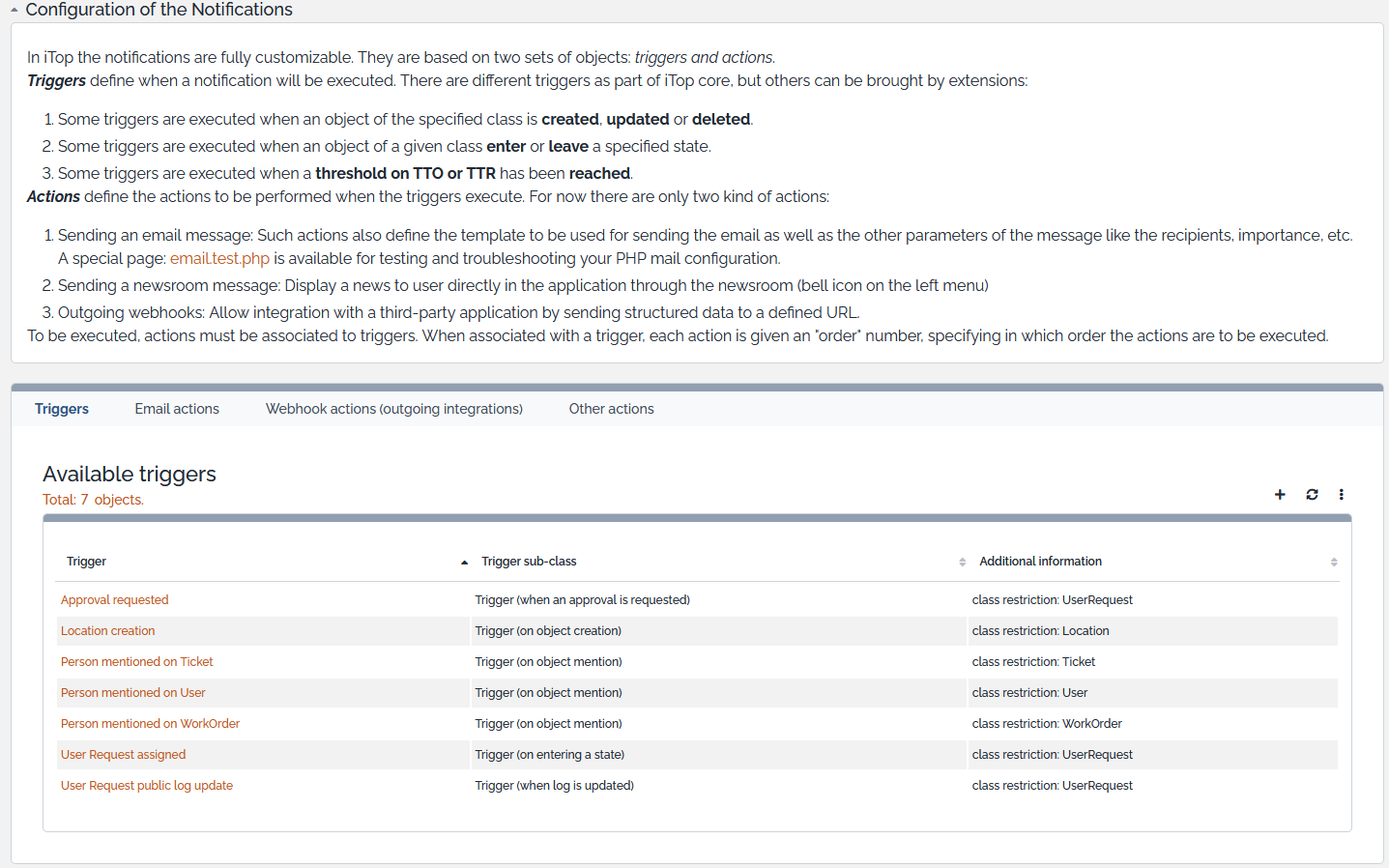 Actions define what will be done. In the current version of iTop, the only available kind of action consist in sending an email.