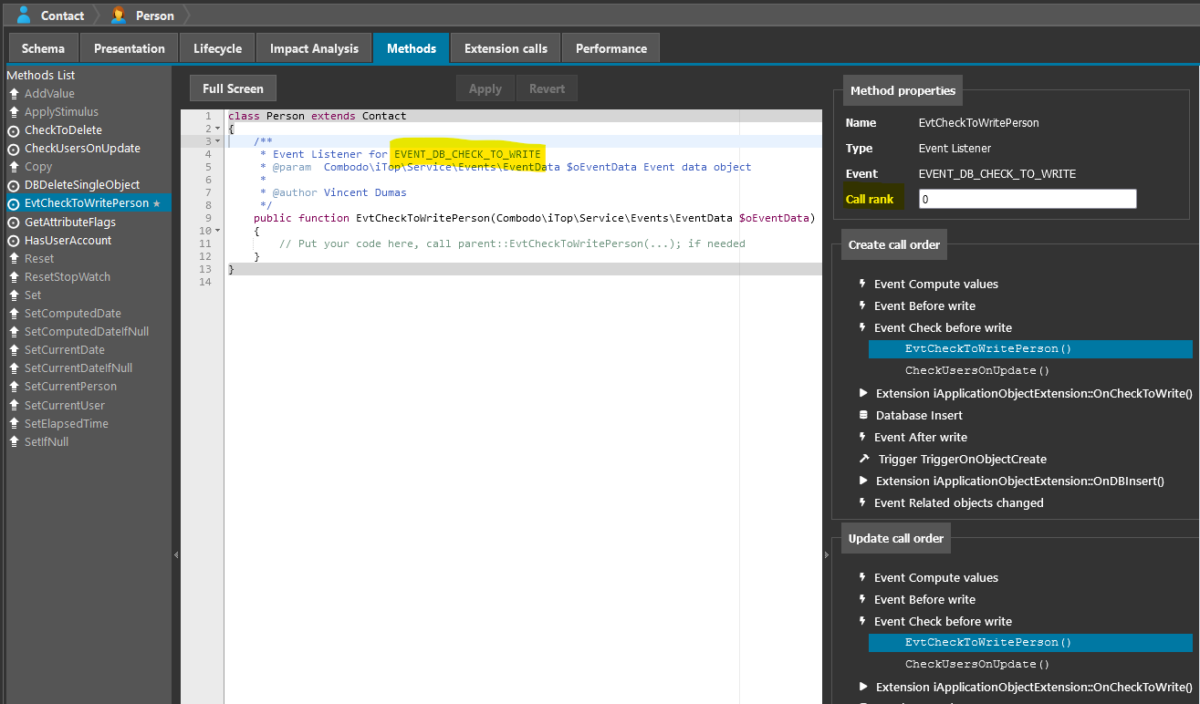 For methods which are impacting the object Creation and Modification, the sequence of calls are displayed in the right panel, so you can understand in which order they will be called