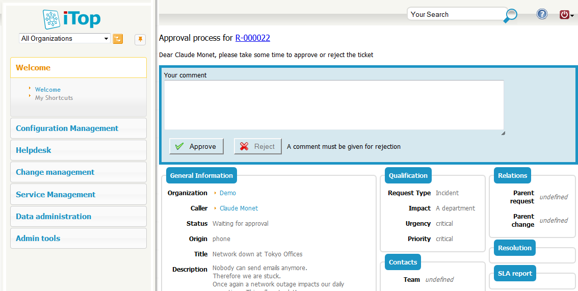 Then the User Request enters the state Waiting for approval and a notification is sent to the Approver. The Approver can approve or reject the request by clicking on the link provided in the email (an iTop login is not mandatory for this action). Alternatively, she can approve or reject from within iTop.