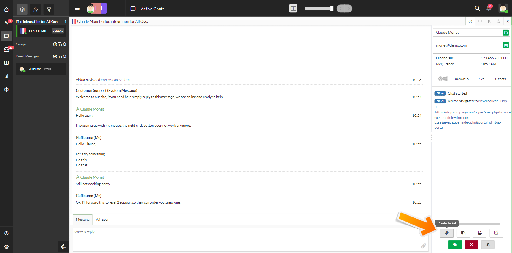 Allow support agents to create a ticket in iTop directly from their tawk.to chat dashboard