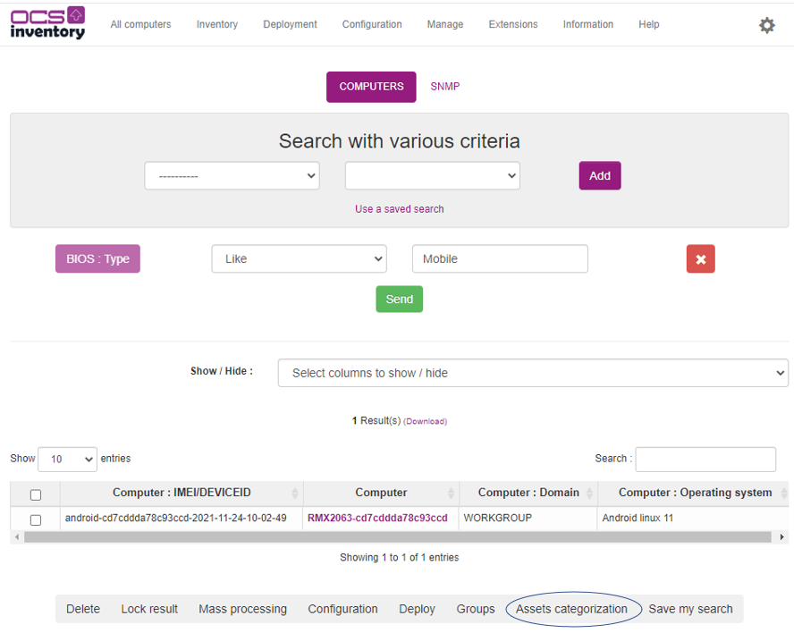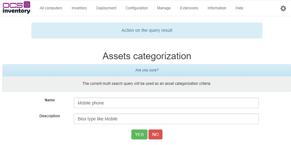 It is necessary to install the small extension Data model for OCS Inventory which adds some fields and an “OCS Inventory” link on synchronized PCs, Servers, Virtual Machines, Mobile Phones and software. This link opens a new tab with the OCS page of the device.