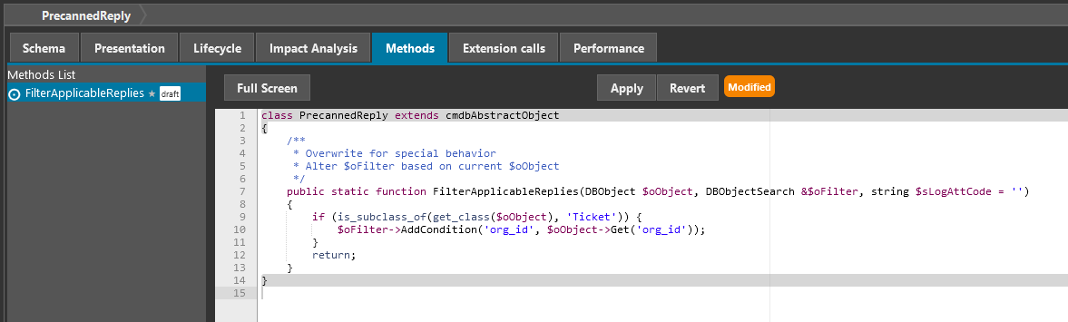 public static function FilterApplicableReplies(DBObject $oObject, DBObjectSearch &$oFilter, string $sLogAttCode = '') { if (is_subclass_of(get_class($oObject), 'Ticket')) { $oContact = UserRights::GetContactObject(); $oFilter->AddCondition('org_id', $oContact->Get('org_id')); } return; }