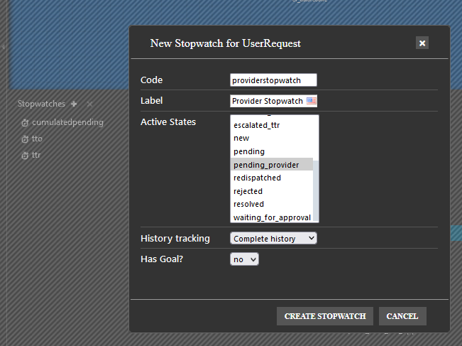 <!-- Add a stopwatch to count the timespent in this state --> <field id="providerstopwatch" xsi:type="AttributeStopWatch" _delta="define"> <states> <!-- here are the states during which the stopwatch is counting time --> <state id="pending_provider">pending_provider</state> </states> <working_time/> <thresholds/> <always_load_in_tables>true</always_load_in_tables> </field>