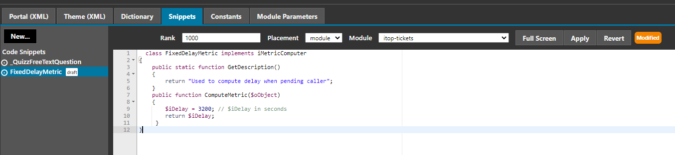 class FixedDelayMetric implements iMetricComputer { public static function GetDescription() { return "iTop configurable delay in hours, 6 by default"; } public function ComputeMetric($oObject) { // goal is expected to be provided in seconds // We can request a delay in hours from a module parameter, defined in the iTop Configuration file $iRes = 3600 * MetaModel::GetConfig()->GetModuleSetting('itop-tickets', 'pending_delay', '6'); return $iRes; } }