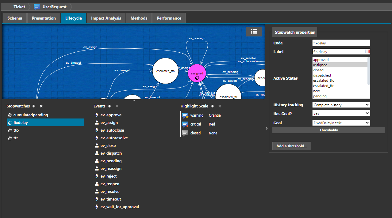 Add a stopwatch attribute on UserRequest class, to count when the ticket is in “assigned” state, with a fixed goal, defined in a configuration parameter.