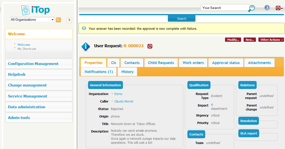 If an incident ticket is parent of a user request, then each time its private and public logs are modified, iTop will automatically update the logs of the child requests. When the parent incident get resolved, iTop will automatically mark the child requests as “resolved”.