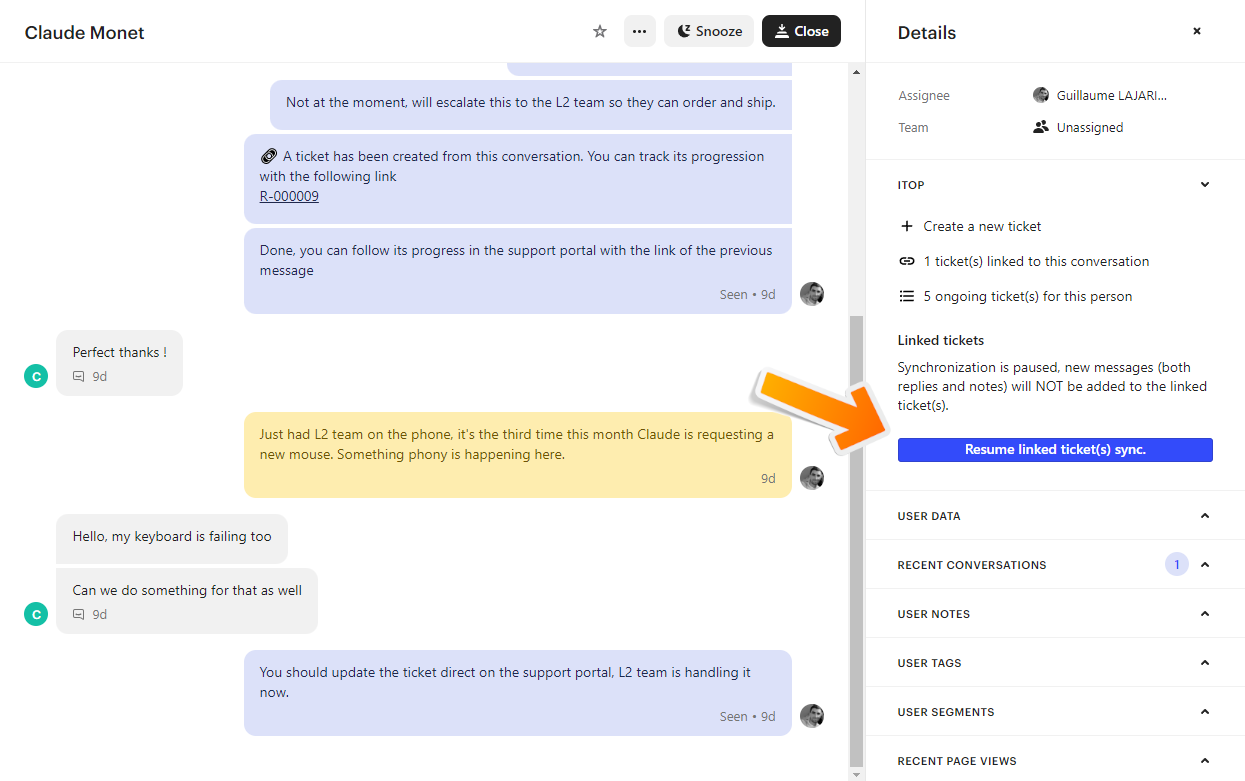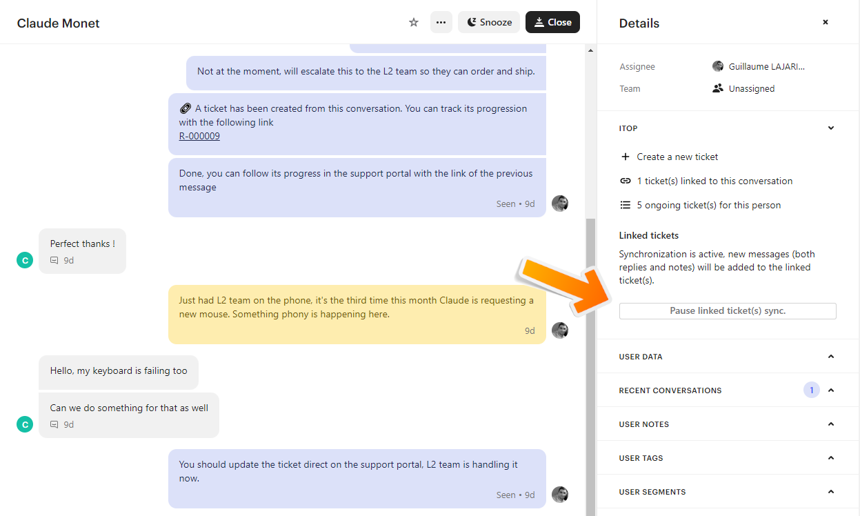 The Intercom support agent can pause/resume the new messages sync to iTop at anytime. This way the ticket won't be flooded with unrelevant messages.
