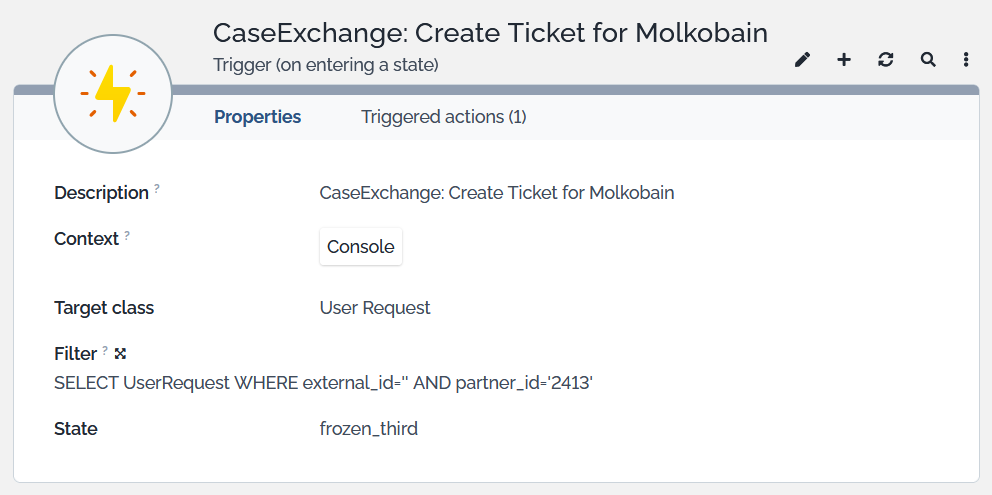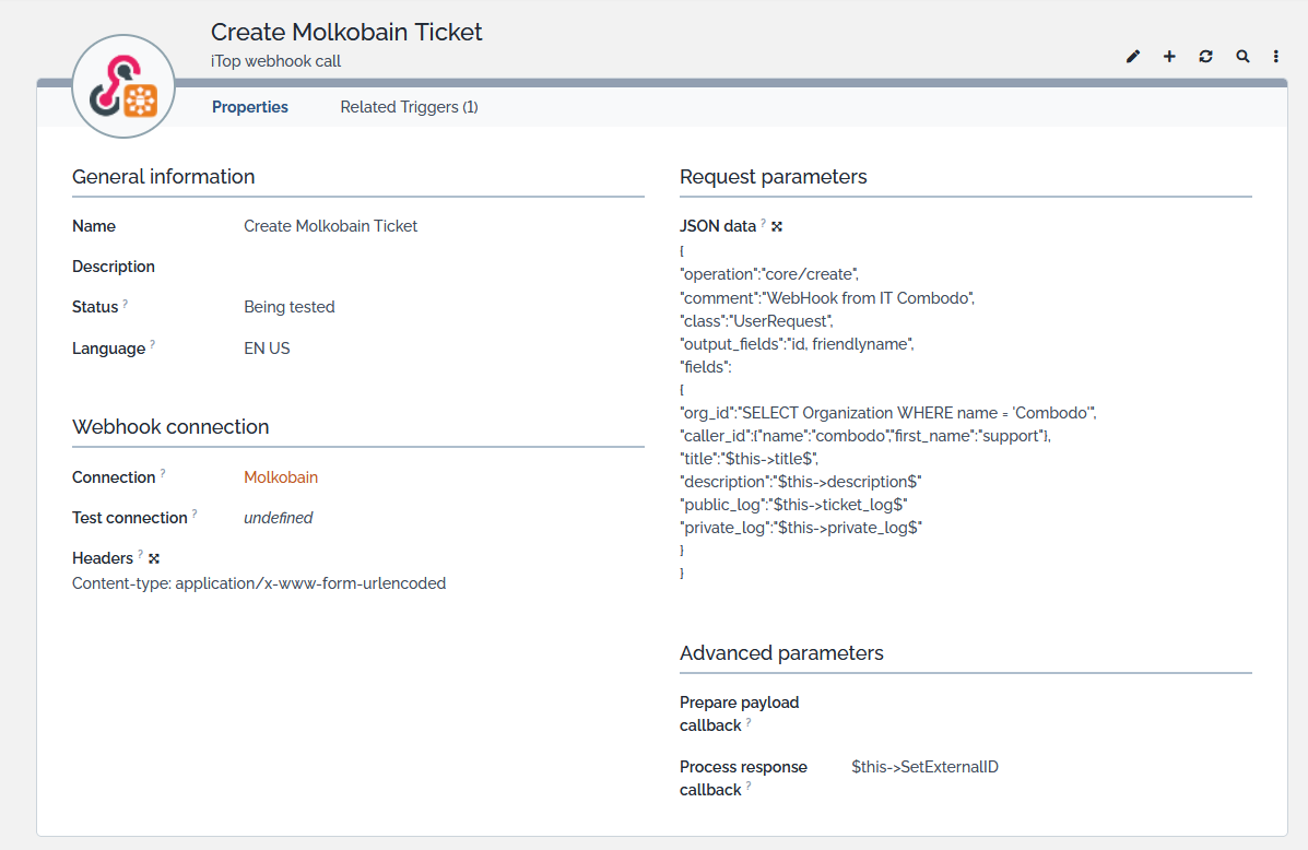 Then create an iTop webhook call, linked to the above trigger, to replicate the Ticket on the partner iTop.
