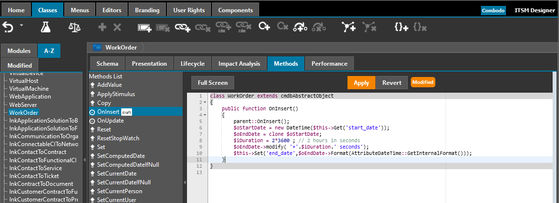 public function OnInsert() { parent::OnInsert(); $oStartDate = new DateTime($this->Get('start_date')); $oEndDate = clone $oStartDate; $iDuration = 2*3600 ; // 2 hours in seconds $oEndDate->modify( '+'.$iDuration.' seconds'); $this->Set('end_date',$oEndDate->Format(AttributeDateTime::GetInternalFormat())); }