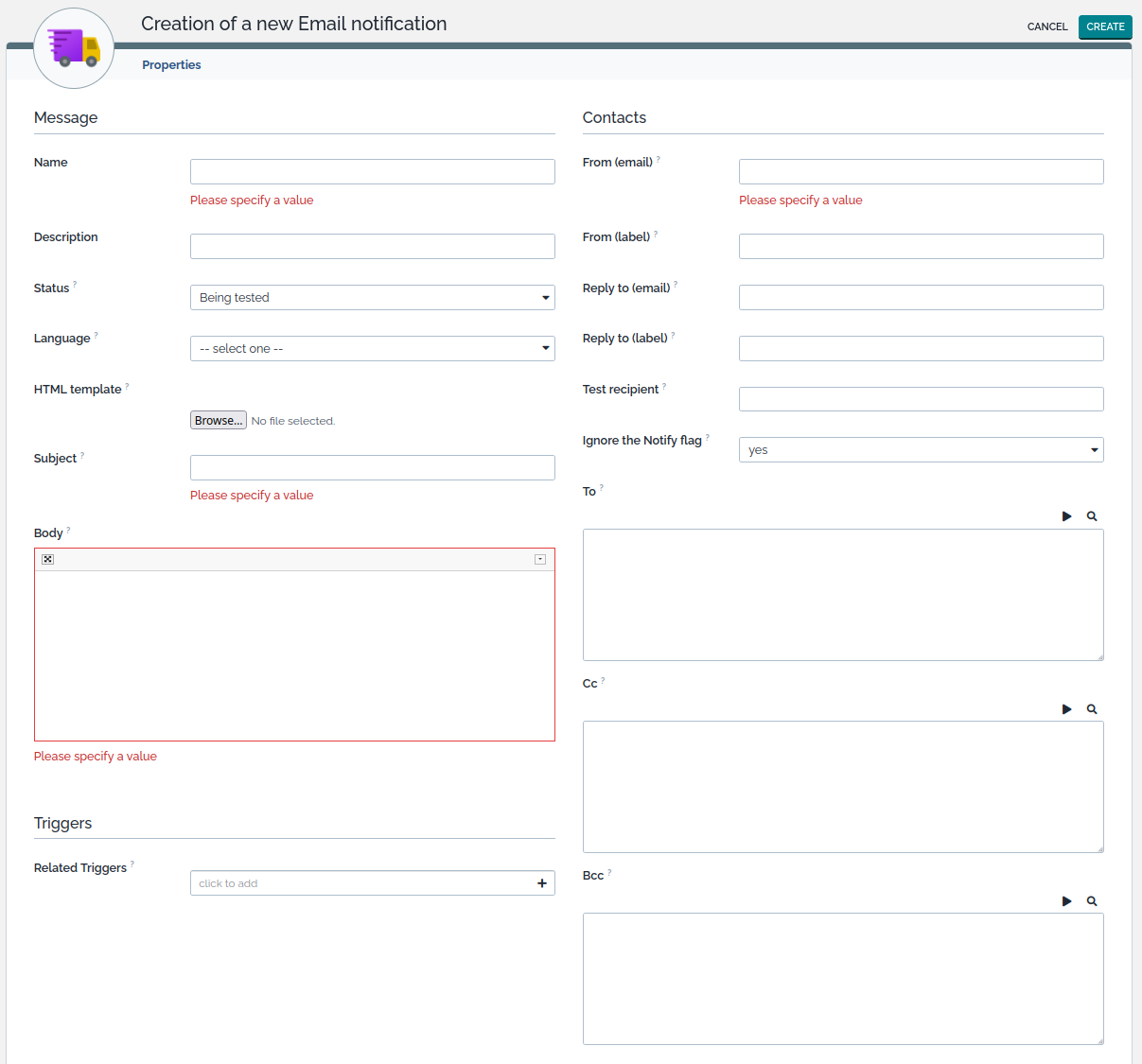Before creating a useful trigger, at least one action must be defined. Email actions are templates for formatting the messages to be sent, the define the content of the message as well that the subject, sender and recipients.