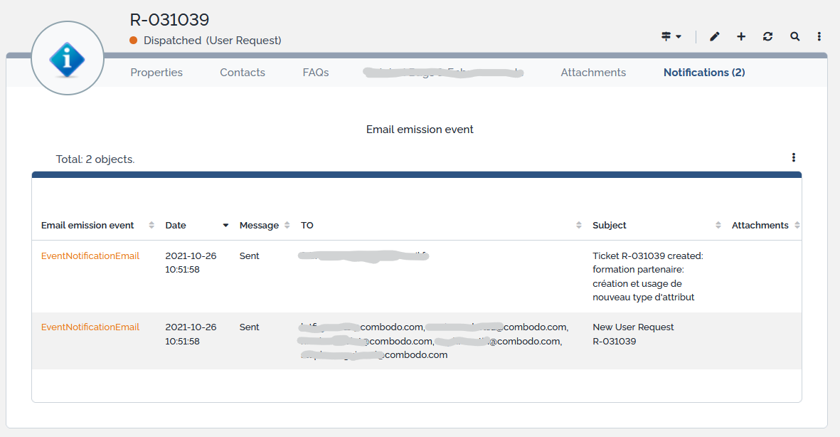 On an iTop object, which has triggered notifications, you can see them in a dedicated tab.