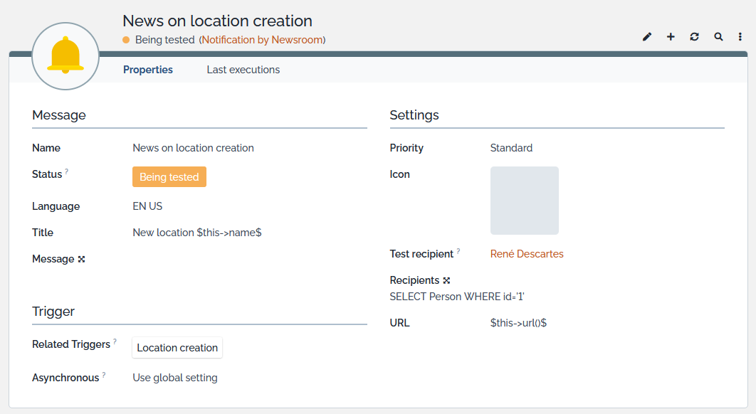 • Being tested: email are sent to Test recipient email address
