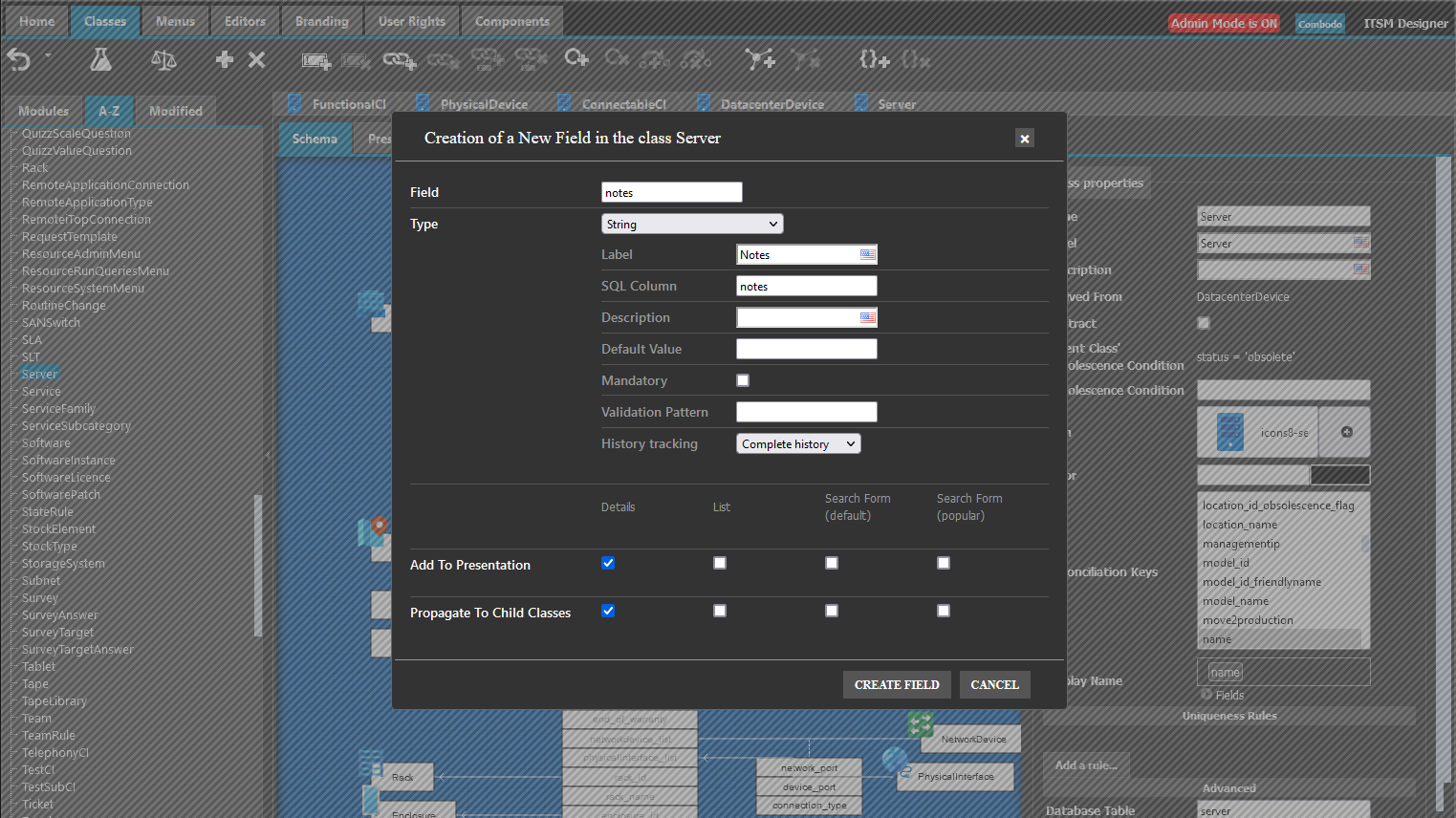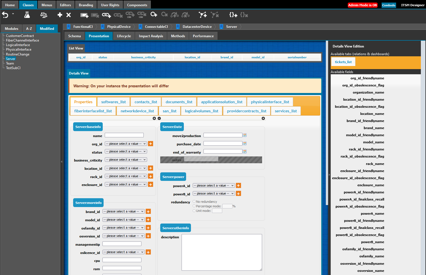 At this point, if you look at the schema of the MySQL database, you can see the additional “notes” column added to the “server” table. However if you navigate to a Server in iTop, nothing has changed.