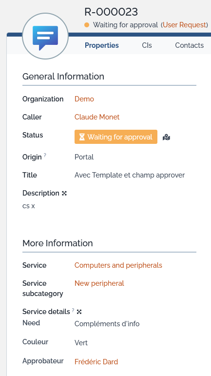 For instance when a user asks for a “new virtual machine”, then we may want him to provide the number of CPUs, the quantity of RAM and the type of OS in structured fields rather than hoping that the user will provide them by himself, in the Description field.