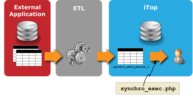 Below is an example of the information flow from an external source into iTop, using an ETL to write the data directly in MySQL.