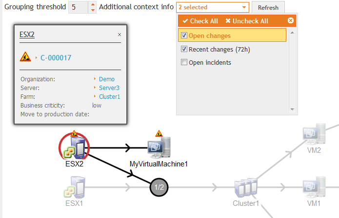When an object in the chart is linked to (at least) one of the context tickets, a small icon representing the type of the ticket (Incident, Change) is displayed next to the icon of the object. The list of tickets linked to a given object is available in the tooltip for this object.