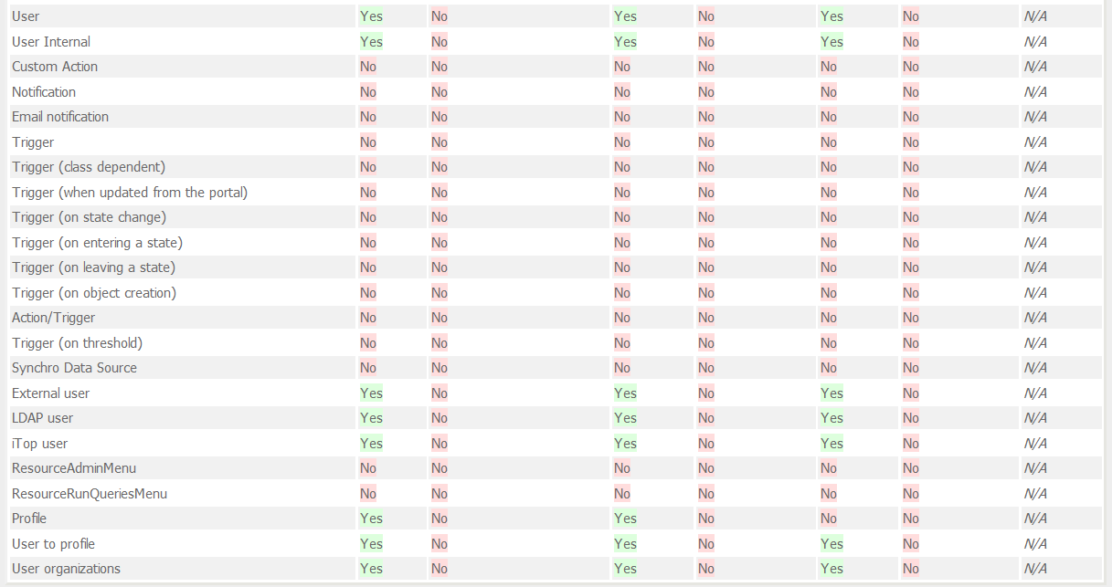 <user_rights> <group id="Notification" _delta="define"> <classes> <!-- This class list is also present in AdminTools group --> <class id="Trigger"/> <class id="lnkTriggerAction"/> <class id="Action"/> <class id="ResourceRunQueriesMenu"/> </classes> </group> <group id="User"> <classes> <!-- This class list is also present in AdminTools group --> <class id="User"/> <class id="URP_UserOrg"/> <class id="URP_UserProfile"/> <class id="URP_Profiles"/> </classes> </group> <group id="Audit"> <classes> <!-- This class list is also present in AdminTools group --> <class id="AuditCategory"/> <class id="AuditRule"/> <class id="ResourceRunQueriesMenu"/> </classes> </group> <group id="Query"> <classes> <!-- This class list is also present in AdminTools group --> <class id="Query"/> <class id="QueryOQL"/> <class id="ResourceRunQueriesMenu"/> </classes> </group> <group id="SynchroData"> <classes> <!-- This class list is also present in AdminTools group --> <class id="SynchroDataSource"/> <class id="SynchroAttribute"/>_ </classes> </group> </user_rights> </itop_design>
