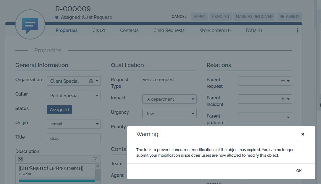 If the lock expires during the modification of the object (because of a loss of the connection or if the computer was put into sleep/power saving mode for too long a time) the user is warned that the lock has been lost by a popup message. When the user closes this popup message, a notification remains at the top of the page and the “action” buttons are disabled (except the “Cancel” button):