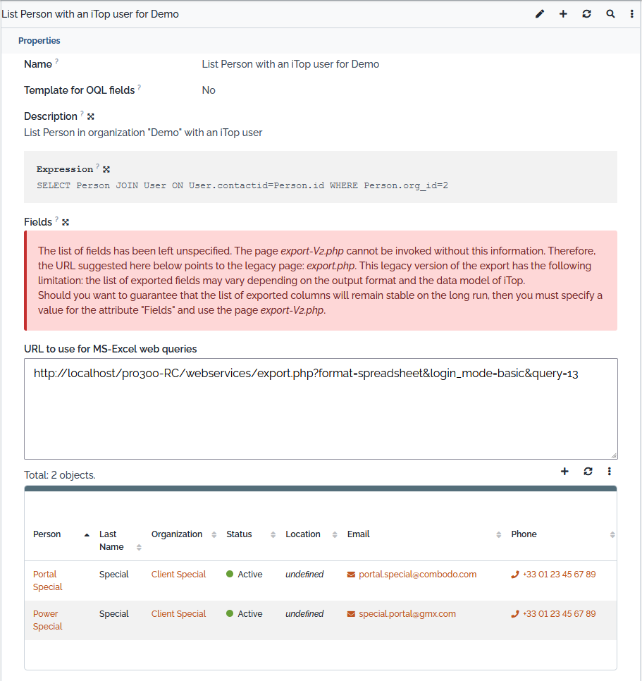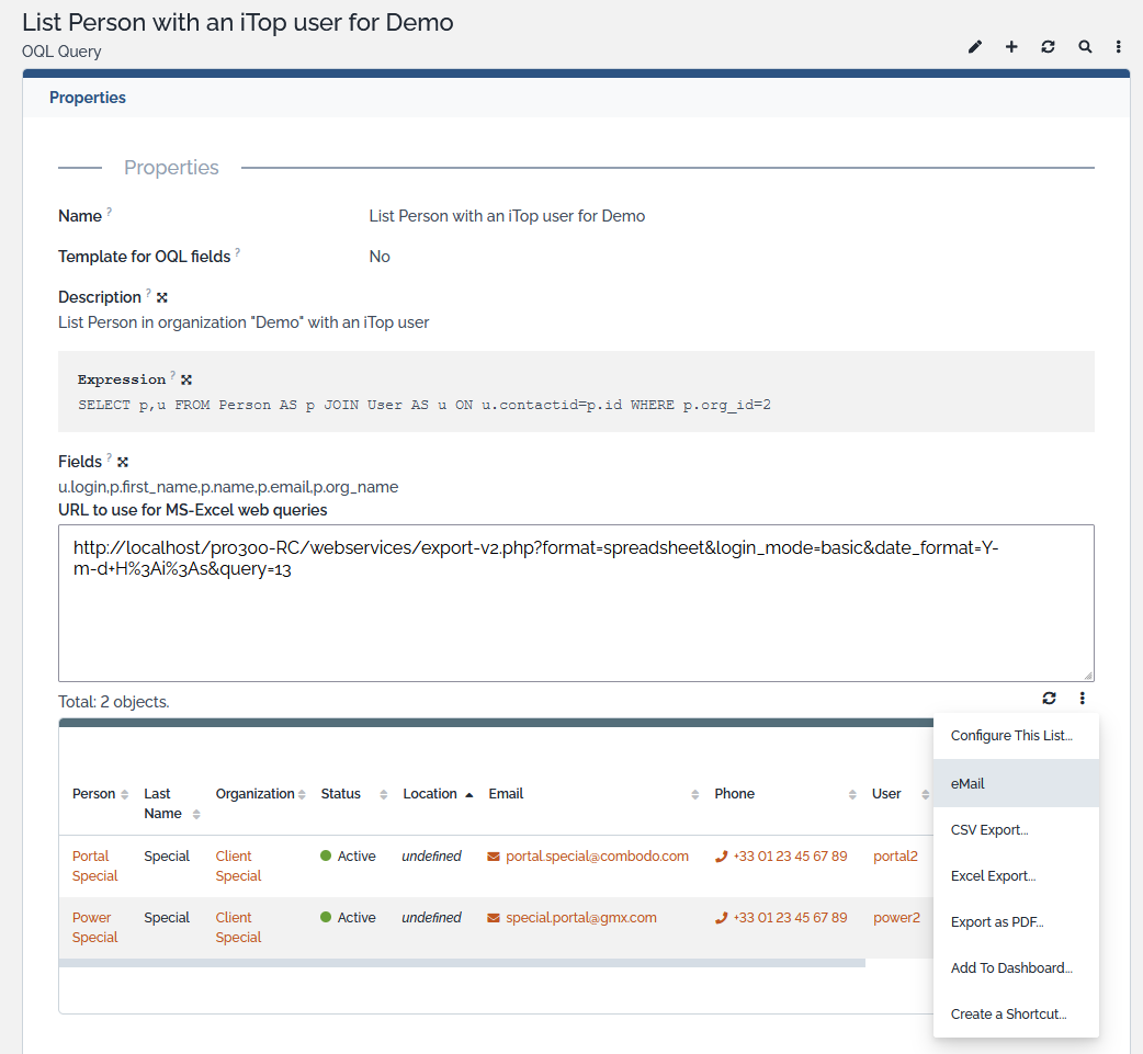 For help about integrating the results into spreadsheet, like Excel, please refer to the chapter How to create a spreadsheet report using iTop queries