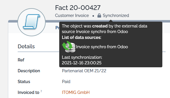 When a configuration item is synchronized with a data source, the display is slightly different in iTop. The actions on a CI may also be limited, depending on the configuration of the data source.