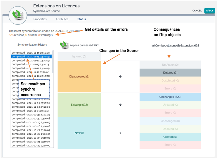 The column at the right displays the consequences of the synchro, in terms of modifications on the associated objects in iTop.