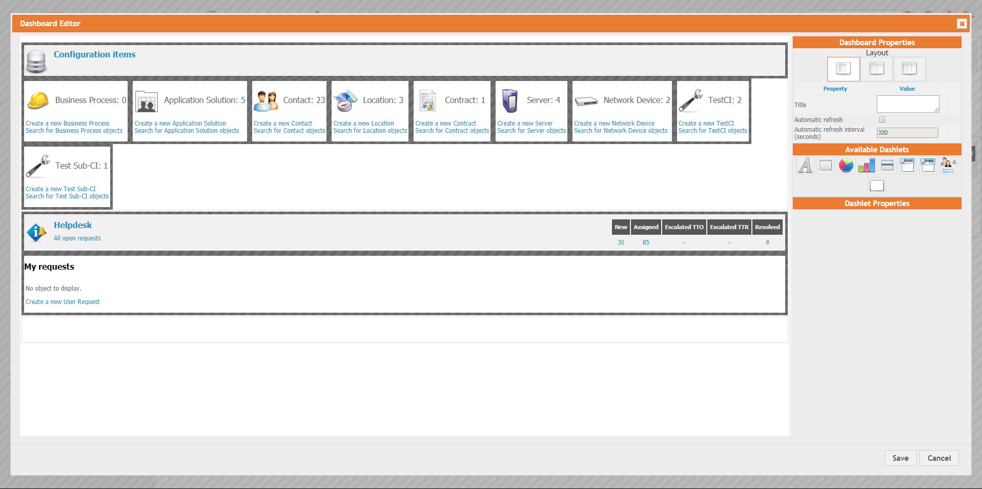 At this point, if you navigate in iTop and click on the “Edit this page” in the “Welcome page”, you can see that “iFrame” is available in the dashlet list:
