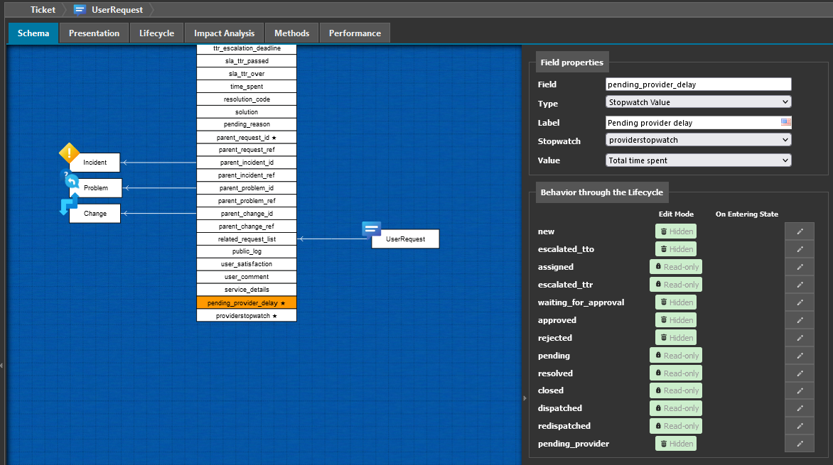 <classes> <class id="UserRequest"> <fields> <!-- Add a new state value to the existing status --> <field id="status" _delta="must_exist"> <values> <value id="pending_provider" _delta="define">pending_provider</value> </values> </field> <!-- Add a stopwatch to count the timespent in this state --> <field id="providerstopwatch" xsi:type="AttributeStopWatch" _delta="define"> <states> <!-- this are the states, during which the stopwatch is counting time --> <state id="pending_provider">pending_provider</state> </states> <working_time/> <thresholds/> <always_load_in_tables>true</always_load_in_tables> </field> <!-- Declaring this stopwatch sub-item is required to display or query it --> <field id="pending_provider_delay" xsi:type="AttributeSubItem" _delta="define"> <target_attcode>providerstopwatch</target_attcode> <!-- Possible item_code: timespent, started, laststart, stopped --> <item_code>timespent</item_code> </field> </fields> <lifecycle> <stimuli> <!-- Add a new stimulus to switch to pending_provider state --> <stimulus _delta="define" id="ev_pending_provider" xsi:type="StimulusUserAction"/> </stimuli> <states> <!-- This level define the state we are in --> <state id="assigned" _delta="must_exist"> <transitions> <!-- this define an available transition from the above state --> <transition id="ev_pending_provider" _delta="define"> <!-- This define the stimulus which trigger the transition --> <!-- on a given state there can only be one transition triggered by a given stimulus --> <stimulus>ev_pending_provider</stimulus> <!-- This define on which state the UserRequest will end-up --> <target>pending_provider</target> <actions/> </transition> </transitions> </state> <!-- From the new state --> <state id="pending_provider" _delta="define"> <flags /> <!-- Also empty it's a mandatory tag --> <transitions> <!-- we want to assign the ticket back to the support team --> <transition id="ev_assign"> <stimulus>ev_assign</stimulus> <target>assigned</target> <actions/> </transition> </transitions> <!-- The fields are the same as in "assigned" state --> <inherit_flags_from>assigned</inherit_flags_from> </state> <state _delta="must_exist" id="new"> <flags> <!-- Hide the pending provider_delay, it will propagate to all chained states --> <attribute id="pending_provider_delay" _delta="define"> <hidden/> </attribute> </flags> </state> <state id="resolved" _delta="must_exist"> <flags> <attribute id="pending_provider_delay" _delta="define"> <!-- Read_only takes precedence on hidden ??? --> <read_only/> </attribute> </flags> </state> </states> </lifecycle> <!-- Display the 2 new fields in the details of the UserRequest --> <presentation> <details _delta="must_exist"> <items> <!-- First column of the UserRequest display --> <item id="col:col0"> <items> <item id="fieldset:Ticket:moreinfo"> <items> <!-- Add the provider timespent delay --> <item id="pending_provider_delay" _delta="define"> <rank>80</rank> </item> <!-- This displays a stopwatch (including some sub-items) --> <!-- This will help you to understand how a stopwatch behave --> <item id="providerstopwatch" _delta="define"> <rank>90</rank> </item> </items> <rank>20</rank> </item> </items> </item> </items> </details> </presentation> </class> </classes> <dictionaries> <dictionary id="EN US"> <entries> <!-- Give a label to the new state --> <entry id="Class:UserRequest/Attribute:status/Value:pending_provider" _delta="define"> <![CDATA[Pending provider]]> </entry> <entry id="Class:UserRequest/Attribute:pending_provider_delay" _delta="define"> <![CDATA[Provider time spent]]> </entry> <entry id="Class:UserRequest/Stimulus:ev_pending_provider" _delta="define"> <![CDATA[Wait for Provider]]> </entry> <entry id="Class:UserRequest/Attribute:providerstopwatch" _delta="define"> <![CDATA[Provider stopwatch]]> </entry> </entries> </dictionary> </dictionaries>