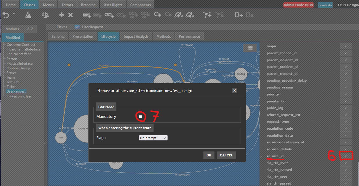 <class id="UserRequest"> <lifecycle> <states> <!-- For User Request in State New... --> <state id="new"> <transitions> <!-- On the transition, trigger by ev_assign stimulus... --> <transition id="ev_assign" _delta="must_exist"> <flags> <!-- We want to force the Service... --> <attribute id="service_id" _delta="define" > <!-- to be provided --> <mandatory/> </attribute> </flags> </transition> </transitions> </state> </states> </lifecycle> </class>