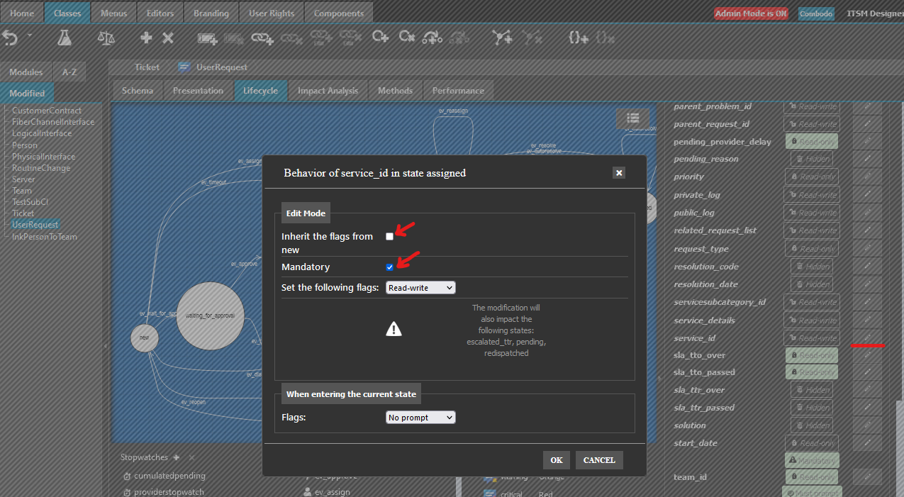 <class id="UserRequest" _created_in="itop-request-mgmt-itil" _delta="must_exist"> <lifecycle> <states> <state id="assigned" _delta="must_exist"> <!-- setting no _delta is equivalent to _delta="merge" --> <flags> <!-- Here we assume that no other extension nor the default datamodel... --> <!-- has set flags on field 'service-id' for state 'assigned' already --> <attribute id="service_id" _delta="define> <mandatory/> </attribute> </flags> </state> </states> </lifecycle> </class>