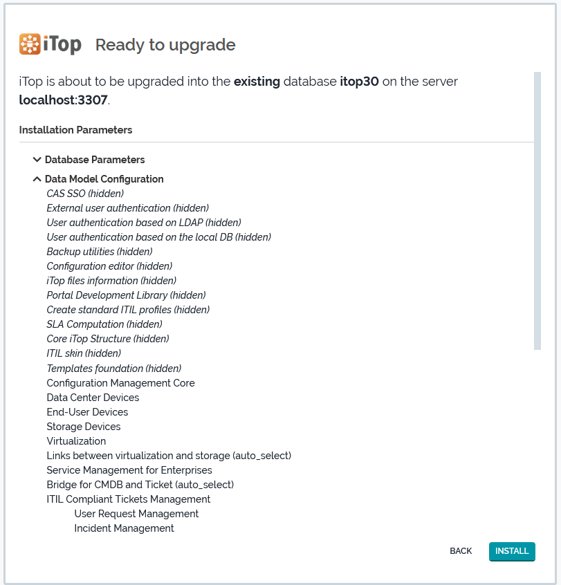 The following steps of the installation wizard will help you tailor the “data model” of iTop in order to best suit your needs.