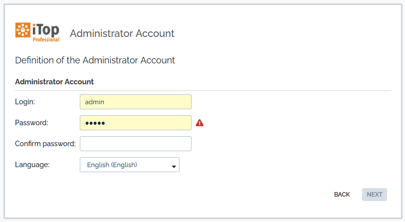 my_server:3309The next step of the wizard prompts you for the information about the administrator account. iTop authentication can rely on external mechanisms (LDAP, Active Directory or JASIG-CAS) but the installation requires that at least one administrator account be created with a local password.