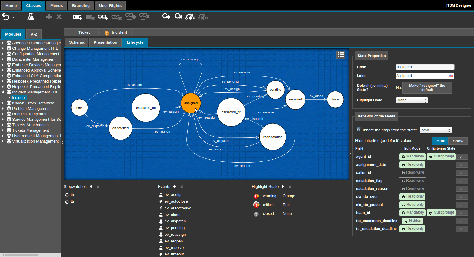 The lifecycle is used to define a simple workflow for classes like tickets, where the behavior of the fields depend on the state of the ticket (a field may be editable only during some specific phases, mandatory in another phase or even completely hidden)