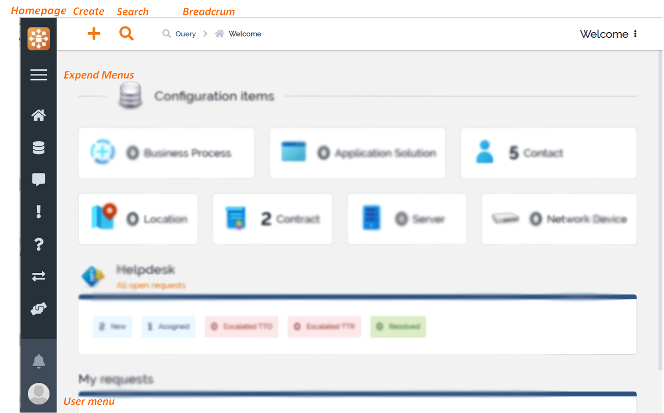 On the left of the screen, a expendable bar contains the Menus for the application. This is the entry point to most iTop features.