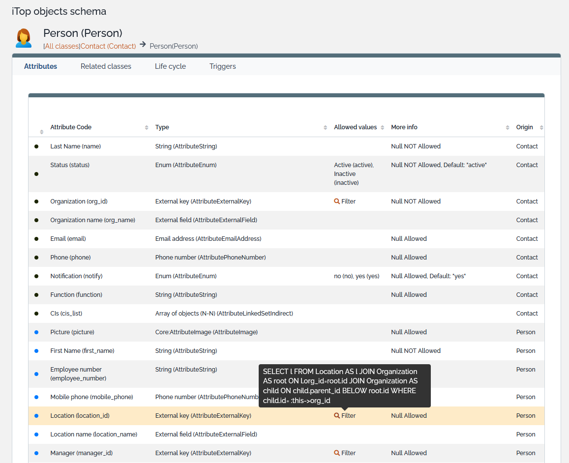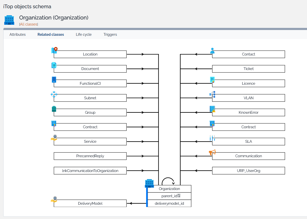 Depending on the modules installed during the setup, the data model of iTop (also called the objects schema) can vary. You can view the current data model used by iTop by clicking on the link “Data Model” in the “Admin Tools” menu.