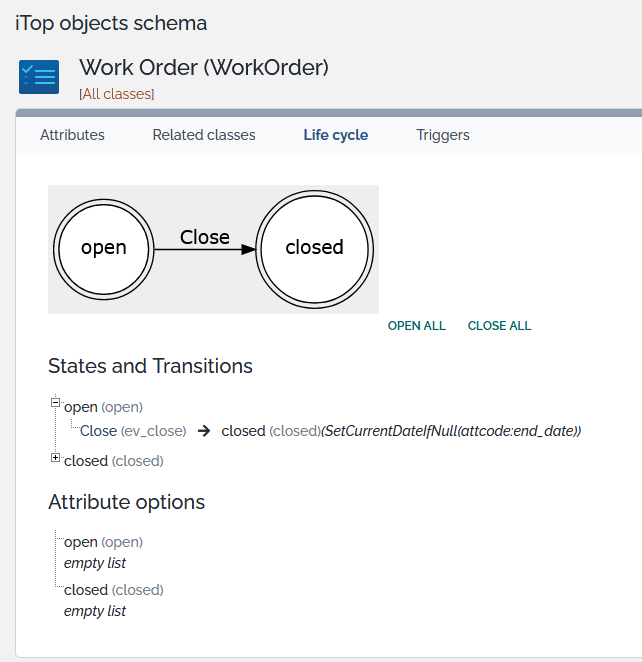 On the Lifecycle tab, if a lifecycle has been set up, a graph build with graphviz will be displayed along with related information about different relationship between states, transitions and attributes options (Read-only, mandatory or hidden).