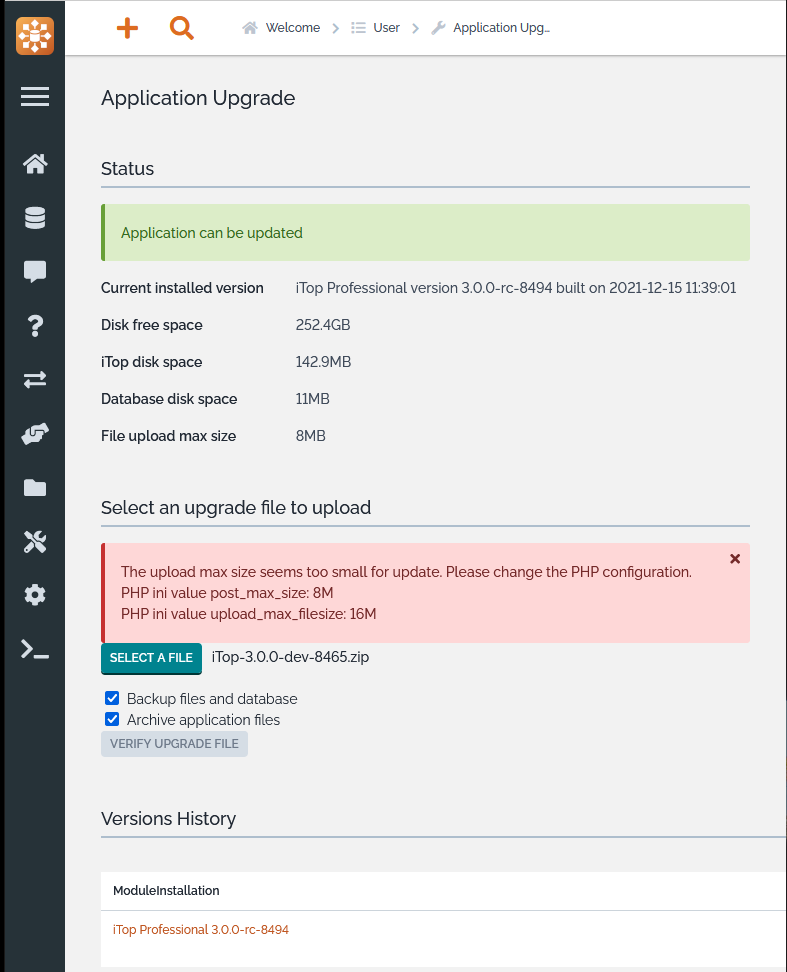 This action, limited to iTop Administrators, allow to upgrade the iTop application code from your web browser, without the need to connect to the iTop server.