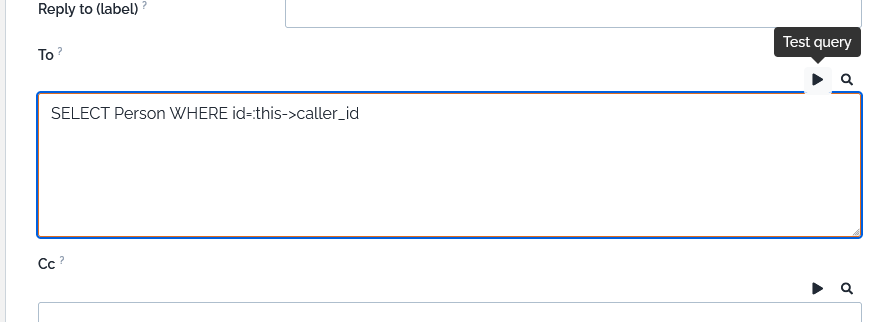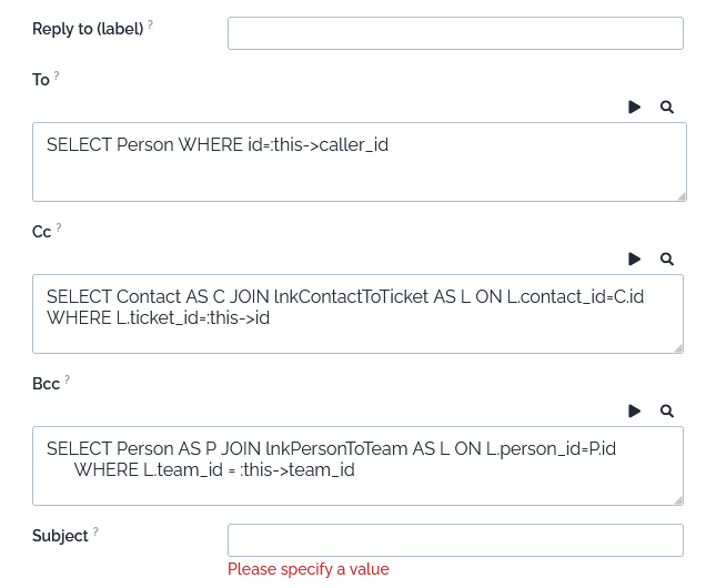The contacts to be notified in the “To”, “Cc”, and “Bcc” are defined by an OQL query. This allows to specify multiple recipients for the notification, like “all the contacts attached to a ticket” or “all the contacts on the impacted site”.