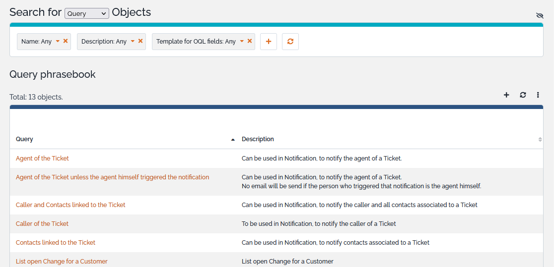 It is possible to create a shortcut on the list or even share the list in an email. In such case, the OQL query will be copied: if the phrasebook entry gets updated later on, that change will not affect the results shown by clicking on the shared link ; only changes in the data will impact the results.