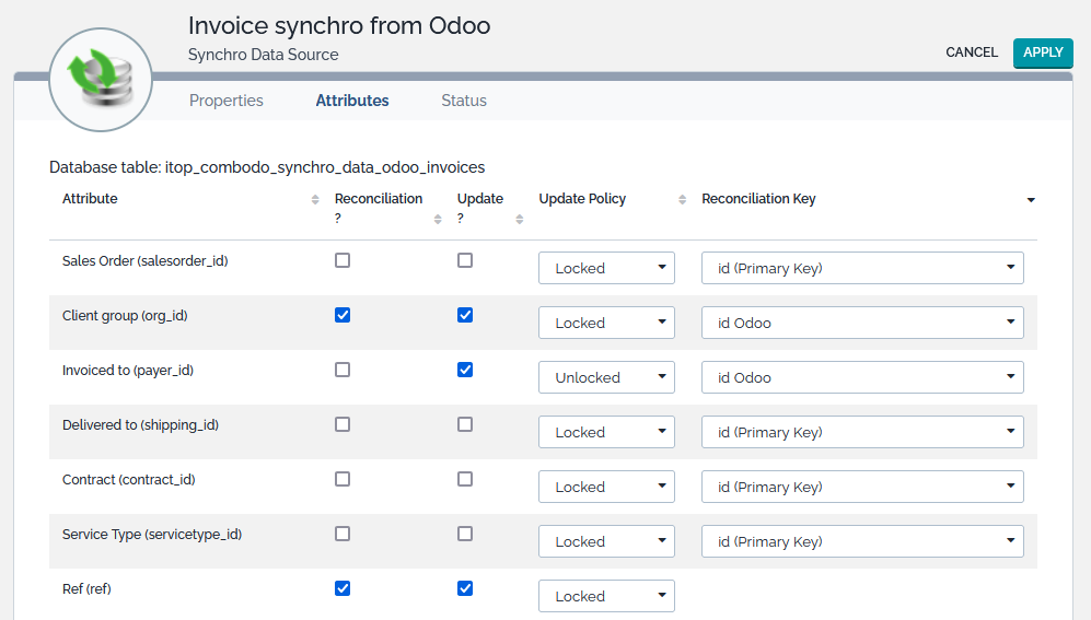 | Update | Specify if that iTop object attribute should be updated by the Datasynchro |