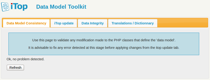 Once all the errors have been fixed, you can apply the modifications to iTop by using the second tab of the toolkit. Click on the button Update iTop Code and Database! to: