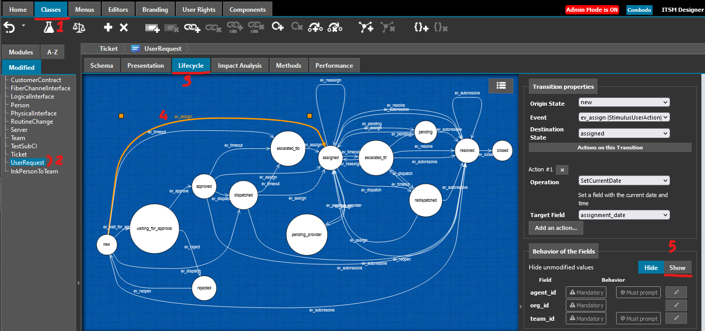 <class id="UserRequest"> <lifecycle> <states> <!-- For User Request in State New... --> <state id="new"> <transitions> <!-- On the transition, trigger by ev_assign stimulus... --> <transition id="ev_assign" _delta="must_exist"> <flags> <!-- We want to force the Service... --> <attribute id="service_id" _delta="define" > <!-- to be provided --> <mandatory/> </attribute> </flags> </transition> </transitions> </state> </states> </lifecycle> </class>