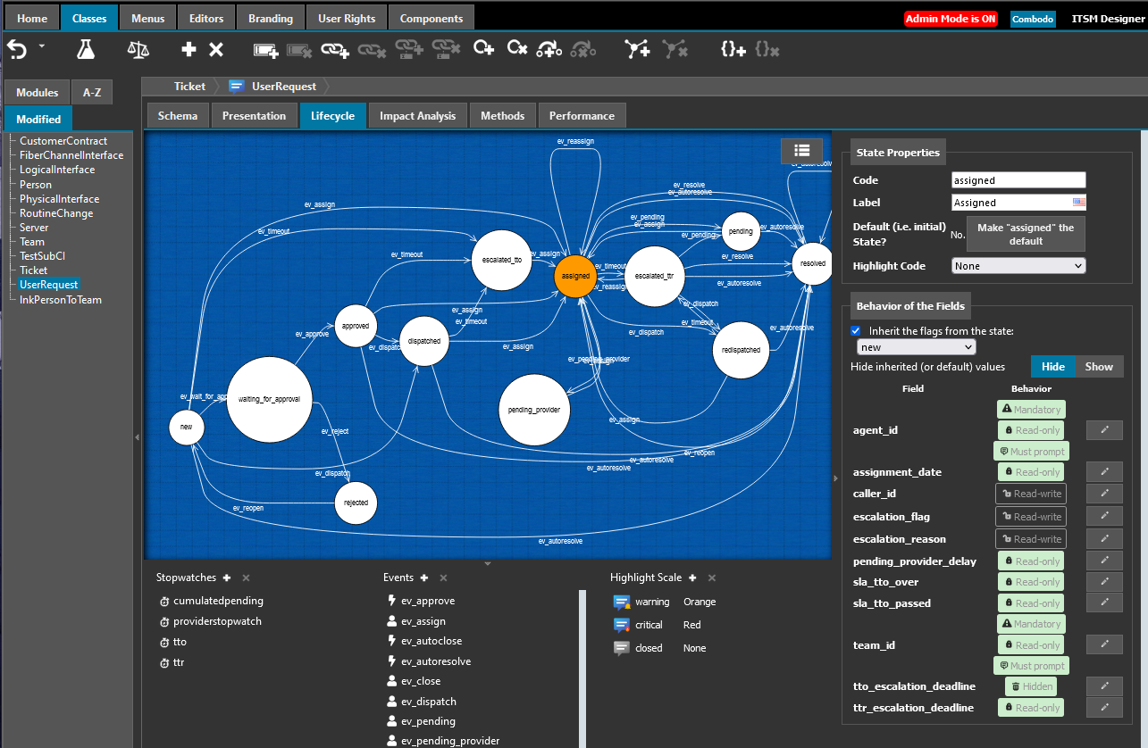 <class id="UserRequest" _created_in="itop-request-mgmt-itil" _delta="must_exist"> <lifecycle> <states> <state id="assigned" _delta="must_exist"> <!-- setting no _delta is equivalent to _delta="merge" --> <flags> <!-- Here we assume that no other extension nor the default datamodel... --> <!-- has set flags on field 'service-id' for state 'assigned' already --> <attribute id="service_id" _delta="define> <mandatory/> </attribute> </flags> </state> </states> </lifecycle> </class>