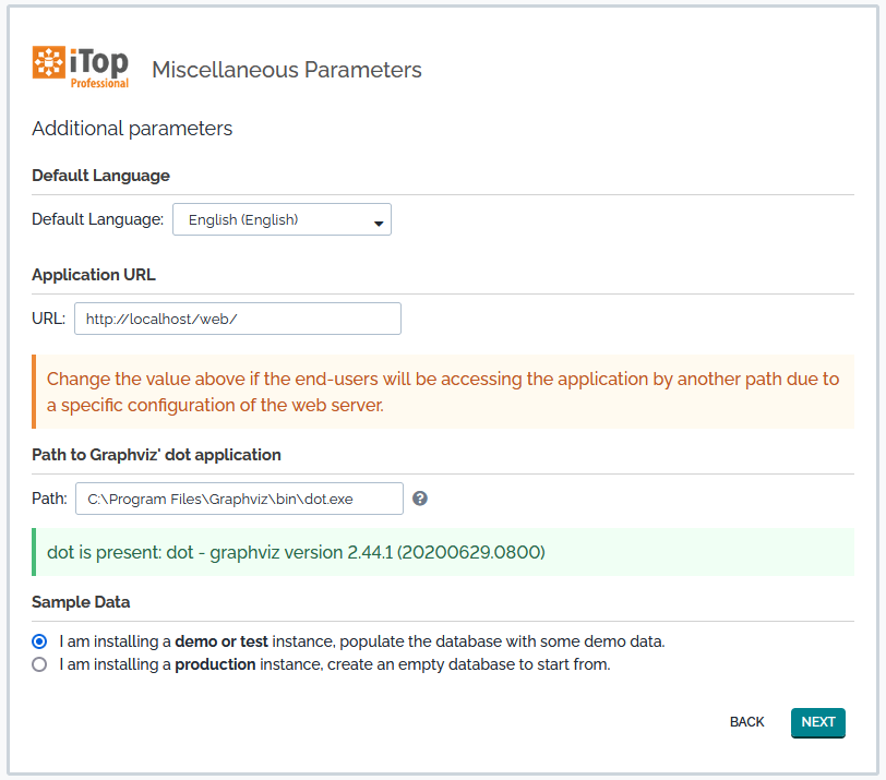 sample data: install sample data if you want to quickly experiment with iTop. Sample data provide some sample configuration items (servers, applications, contacts) and default settings for the service catalog in order to ensure a quick deployment of the application. Do not select this option if you are deploying a production instance of iTop and want a “clean” installation.