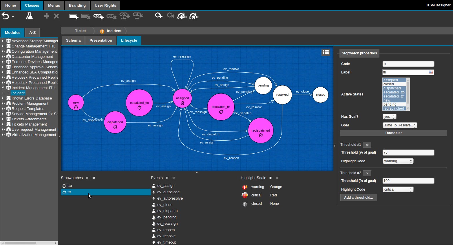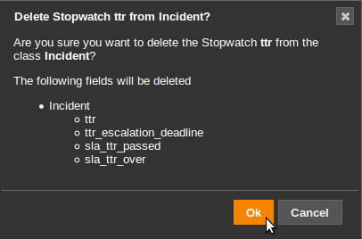 A stopwatch can also be configured to have a goal (i.e. to compute a deadline). The goal is configured as a special class providing the algorithm about how to compute a duration for the stopwatch. iTop provides two classes to compute goals based on either the “Time To own” or “Time To Resolve” SLTs.
