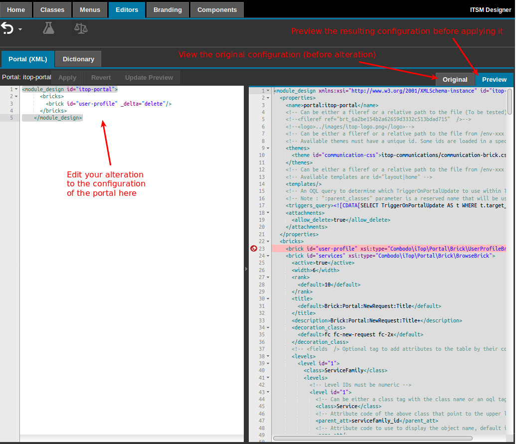 This tab displays - side by side - the XML alteration to the portal configuration (on the left) and either the original XML or the resulting XML (on the right).