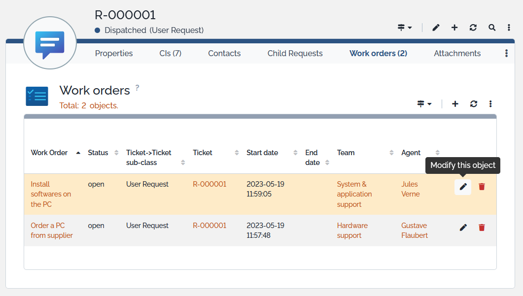 Example of a Ticket, on which one's can create, modify or delete associated Work Orders