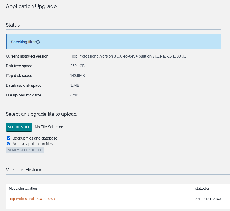 This action, limited to iTop Administrators, allow to upgrade the iTop application code from your web browser, without the need to connect to the iTop server.