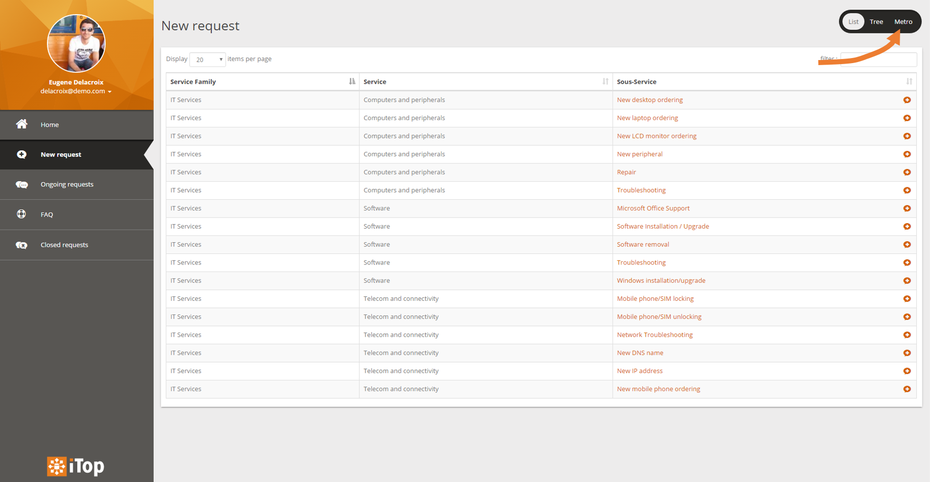 Finally run an upgrade of your iTop system with the new extension option checked and access the portal. You will see that the new mode is now available on the top right corner of the “New request” brick.