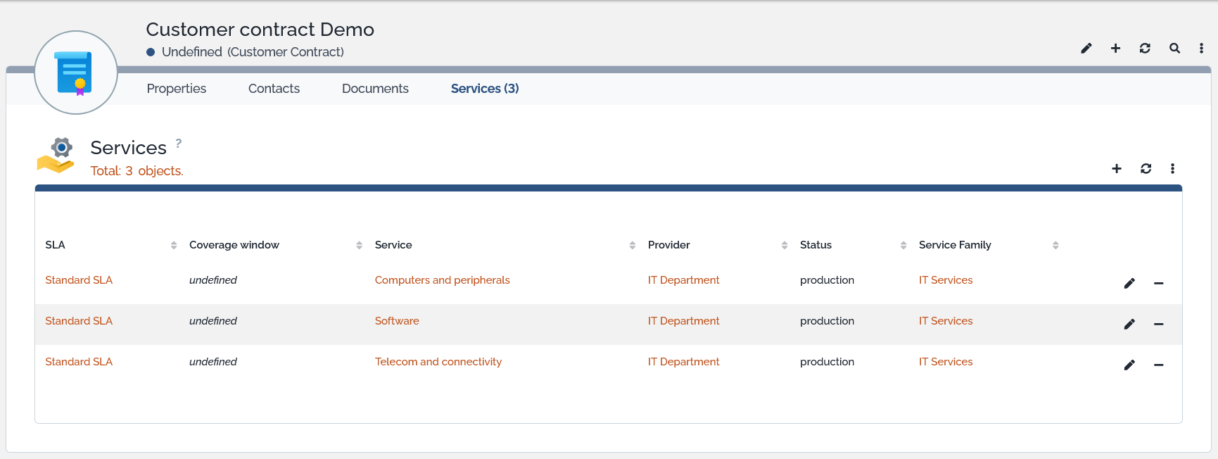You can also link configuration items that are covered by a provider contract. For each customer contracts you can link documents, and contacts related to it.