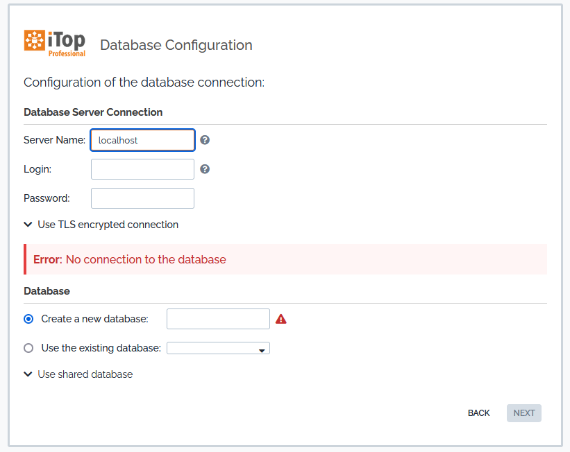 The fourth step of the wizard prompts you for the credentials to connect to MySQL and the database to use for installing iTop. Make sure that you supply an account with enough rights for installing and running iTop. This account needs to create tables, triggers and views in the database, as well as drop views in case of upgrade. If you choose to let the setup create a new database for you, this account needs to have enought rights to do it.